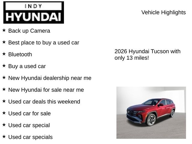 Recent Arrival! $3,637 off MSRP! Ultimate Red 2026 Hyundai Tucson Hybrid SEL Convenience Back up Camera, Best place to buy a used car, Bluetooth, Buy a used car, New Hyundai dealership near me, New Hyundai for sale near me, Used car deals this weekend, Used car for sale, Used car special, Used car specials, Used cars near Indianapolis, Used cars near me, Tucson Hybrid SEL Convenience, 4D Sport Utility, 1.6L Turbo GDI 4-Cylinder, 6-Speed Automatic, AWD, Ultimate Red, Black Premium Synthetic. Tucson Hybrid SEL Convenience is nicely equipped with Option Group 01, Tucson Hybrid SEL Convenience, 4D Sport Utility, 1.6L Turbo GDI 4-Cylinder, 6-Speed Automatic, AWD, Ultimate Red, Black Premium Synthetic, 18x 7.5J Alloy Wheels, 4-Wheel Disc Brakes, 6 Speakers, ABS brakes, Air Conditioning, All Season Fitted Liners, Alloy wheels, AM/FM radio: SiriusXM, Apple CarPlay & Android Auto, Auto High-beam Headlights, Auto-dimming Rear-View mirror, Automatic temperature control, Brake assist, Bumpers: body-color, Cargo Net, Cargo Tray, Carpeted Floor Mats, Delay-off headlights, Driver door bin, Driver vanity mirror, Dual front impact airbags, Dual front side impact airbags, Electronic Stability Control, Emergency communication system: None, First Aid Kit, Four wheel independent suspension, Front anti-roll bar, Front Bucket Seats, Front Center Armrest, Front dual zone A/C, Front reading lights, Fully automatic headlights, H-Tex Trimmed Seat Trim, Heated door mirrors, Heated Front Bucket Seats, Heated front seats, Illuminated entry, Leather steering wheel, Low tire pressure warning, Occupant sensing airbag, Outside temperature display, Overhead airbag, Overhead console, Panic alarm, Passenger door bin, Passenger vanity mirror, Power door mirrors, Power driver seat, Power Liftgate, Power steering, Power windows, Radio data system, Radio: AM/FM/HD Audio System, Rear anti-roll bar, Rear reading lights, Rear seat center armrest, Rear side impact airbag, Rear window defroster, Rear window wiper, Remote keyless entry, Security system, Speed control, Split folding rear seat, Spoiler, Steering wheel mounted audio controls, Tachometer, Telescoping steering wheel, Tilt steering wheel, Traction control, Trip computer, Turn signal indicator mirrors, and Variably intermittent wipers. AWD 6-Speed Automatic 1.6L Turbo GDI 4-Cylinder 37/36 City/Highway MPG Vehicle description, options, price and trim may not be accurate due to automated processes. Bob Rohrmans Indy Hyundai proudly selling a