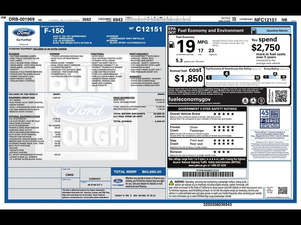 SUMMARY Clean Carfax! One Owner!**EQUIPMENT GROUP 302A** ($5,955 ADD TO MSRP), **3.5L V6 ECOBOOST** ($2,735 ADD TO MSRP), **TRAILER TOW PACKAGE** ($1,325 ADD TO MSRP), BED UTILITY PACKAGE, 3.55 ELECTRONIC LOCK RR AXLE, XLT SPORT APPEARANCE PACKAGE, EXTENDED RANGE 36GAL FUEL TANK, POWER-SLIDING REAR WINDOW, 3.5L V6, ELEC TEN-SPEED AUTO W/TOW M, 4WD, ALL-TERRAIN TIRES, 36 GALLON FUEL TANK, KEYLESS ENTRY, PUSH BUTTON START, REMOTE START, SYNC 4, FORDPASS CONNECTT 4G, HOTSPOT TELEMATICS MODEM, REAR VIEW CAMERA, POWER-SLIDING REAR WINDOW, PICKUP BOX TIE DOWN HOOKS, TRAILER SWAY CONTROL, BLIS W/CROSS-TRAFFIC ALERT, DYNAMIC HITCH ASSIST, LANE-KEEPING SYSTEM, POST-COLLISION BRAKING, PRE-COLLISION ASSIST W/AEB, SOS POST-CRASH ALERT SYSTEM, INTEGRATED TRAILER BRAKE CONTROLLER EQUIPMENT Safety and Security The vehicle is equipped with a system that senses, and then prepares, the vehicle and/or occupants, for an impending forward collision. The vehicle constantly monitors the roadway in front of the vehicle and identifies and tracks pedestrians on an interior display. If the system determines a likely impact, it will automatically take preventative steps to avoid hitting the pedestrian.Technology and Telematics Without the need for a manufacturer specific app to be installed on the smart device, the vehicle infotainment system can access and control functions of a smart device physically plugged-into the vehicle. AppLink/Apple CarPlay and Android Auto smart device wireless mirroring AppLink/Apple CarPlay/Android Auto smart device wireless mirroring PACKAGES XLT Chrome Appearance PackageChrome Door and Tailgate Handles with Body-Color Bezel2-Bar Style Grille with Chrome